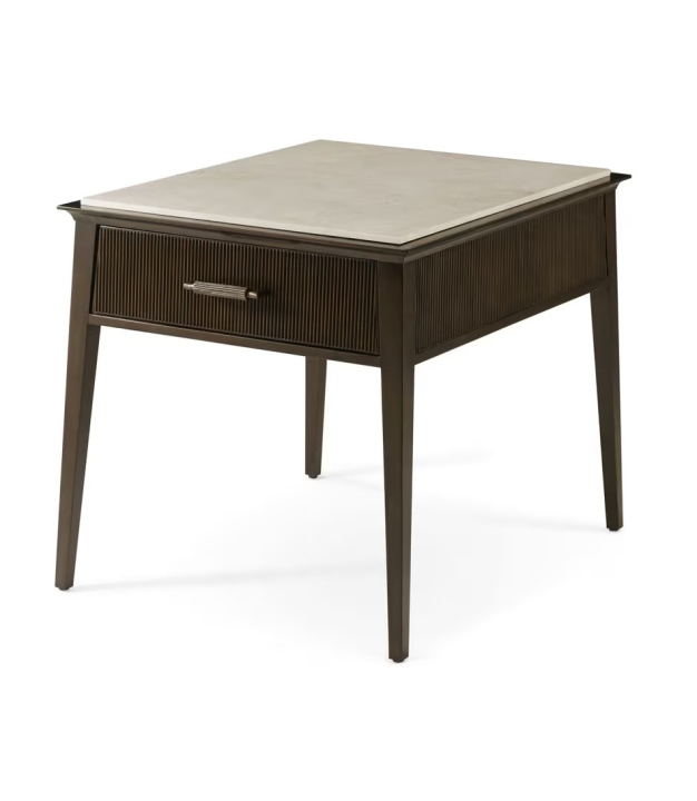 Lido sānu galds no dižskabāržā ar Prima Vera finierējumu tumšā Bistre krāsā, papildināts ar noslīpētu Crema Marfil marmora virsmu. Galdam ir elegants konusveida siluets, rievotas dekoratīvās līnijas un individuāli kalta bronzas furnitūra tumšā apdarē, kas atkārto rievoto motīvu.
